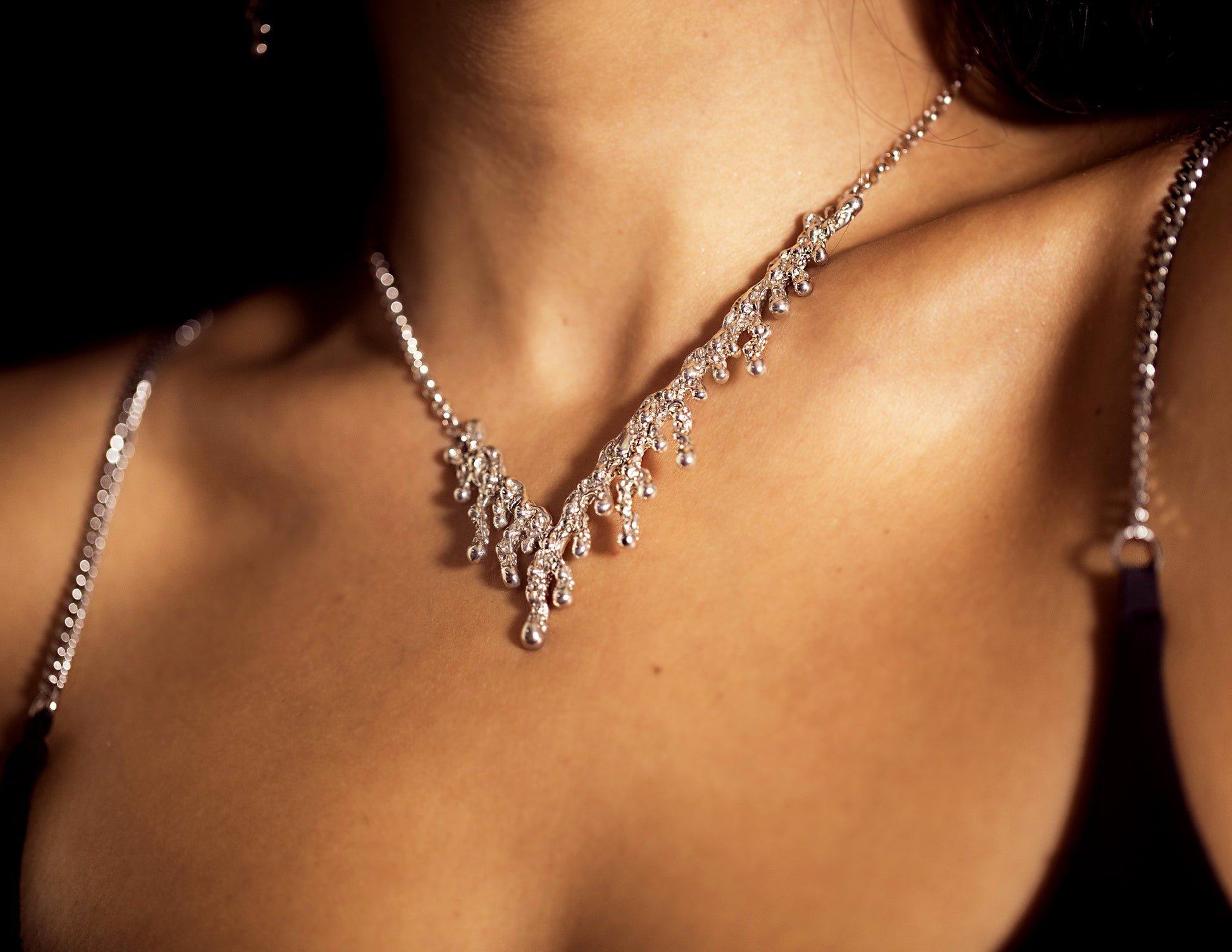 This necklaces makes a bold statement no matter what the outfit. It will most definitely get a conversation started. It features a unique asymmetrical V shape and appears to drip down the body. The V necklace is a great piece for those who collect one of a kind jewelry.